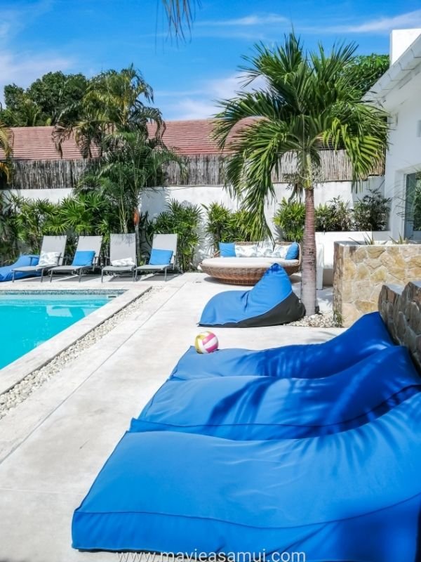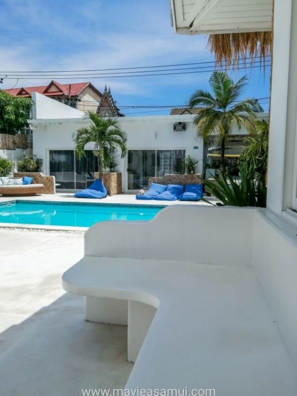 Les couleurs des logements sont le bleu et le blanc (clin d’œil à la Grèce). Une belle promenade droite (seaside) mène de la piscine et à la plage, desservant ainsi deux rangées de bungalows. Les logements les moins chers sont les « seaside » à 30 Euros actuellement. Les plus chers sont ceux avec terrasse devant la plage et une vue mer imprenable sur toute la baie de Bangrak, Big Buddha et l’île de Koh Phangan. Accès immédiat à la plage. Prix bon plan également pour ceux en bord de plage : ~ 80€ la nuitée (2 grands lits et 1 petit lit, 5 personnes).