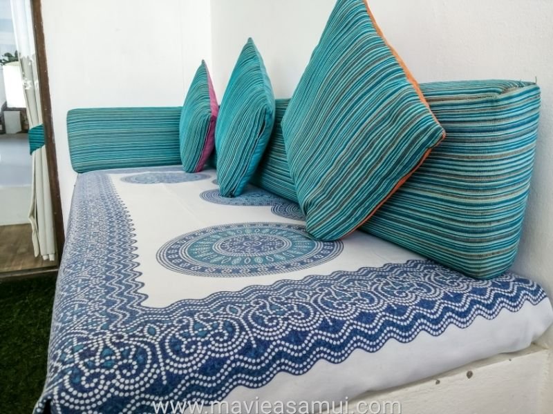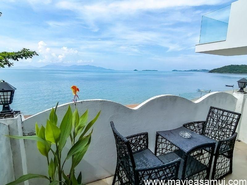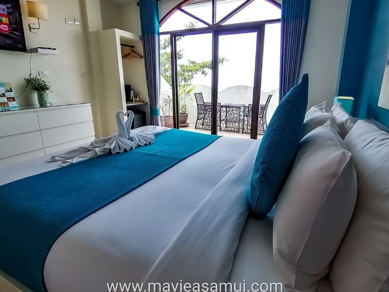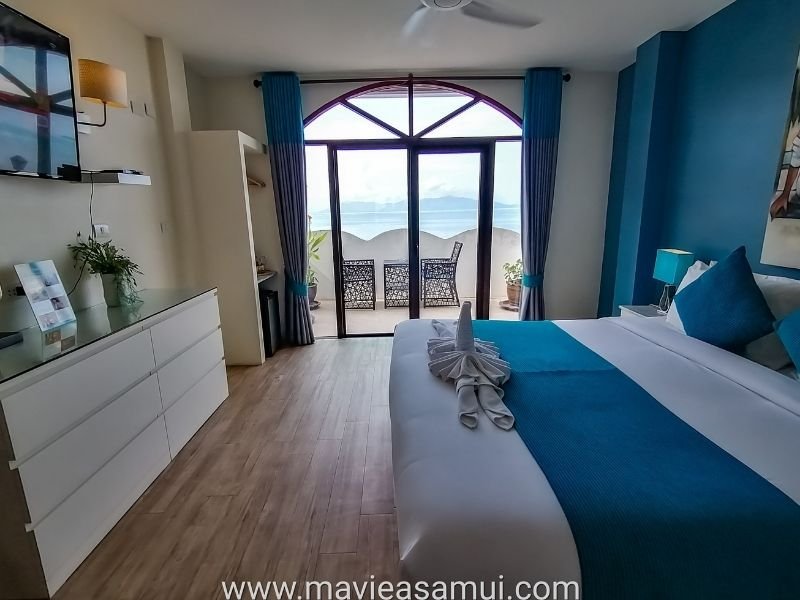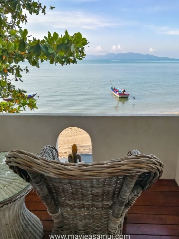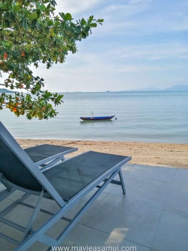 Voici mes photos prises lors de ma visite. La première chambre est la chambre Deluxe avec terrasse et sa vue mer imprenable sur la baie de (Bophut) et l’île de Koh Phangan à l’horizon. La terrasse surplombe la plage de sable. L’hôtel Hacienda propose 4 chambres de ce type. Cette chambre est actuellement en promotion à 54€. Les 2 chambres en promotion à 32€ sont les mêmes, un poil plus petite mais avec une vue village.