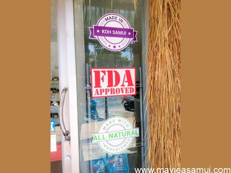 La boutique de vente des produits cosmétiques Secret Of Samui se situe avant l’entrée de Fisherman’s Village dans le nord de l’île de Koh Samui (quartier de Bophut).
