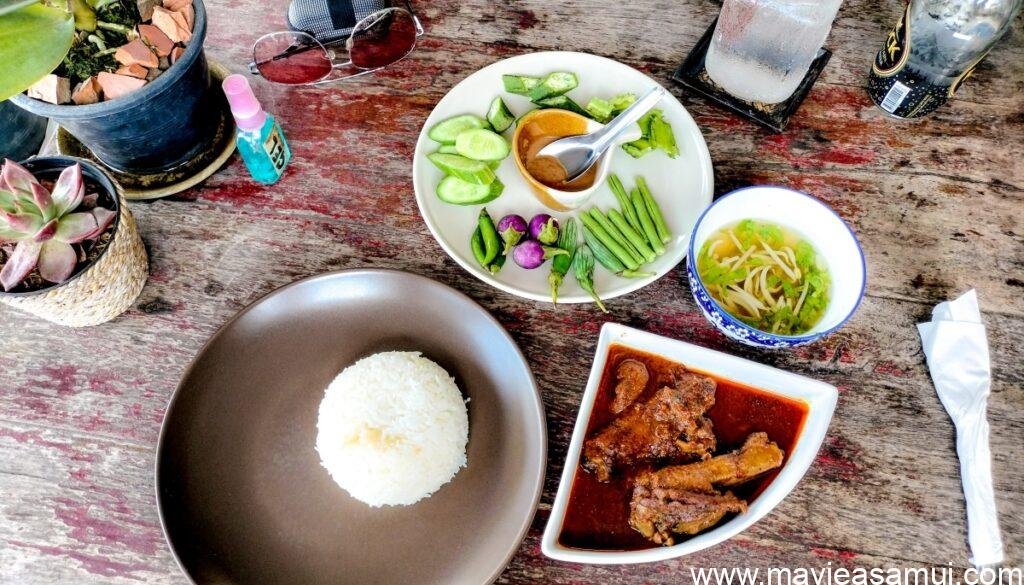 Les currys de viande sont généralement servis avec du riz vapeur, un bol de soupe claire et des légumes crus, comme différentes petites aubergines thaïes, accompagnés d’une sauce de poisson.